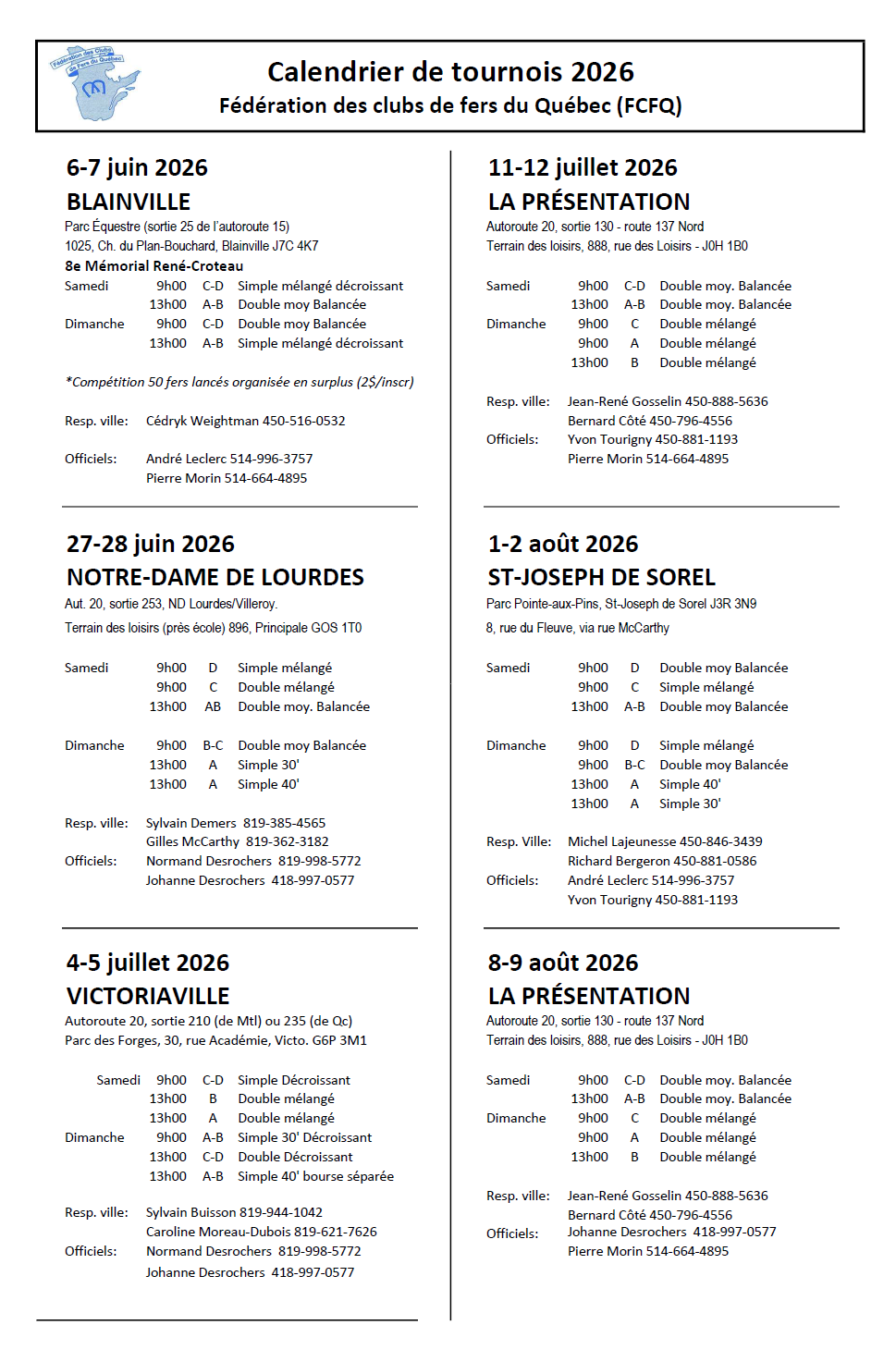 Calendrier de tournois FCFQ 2026
