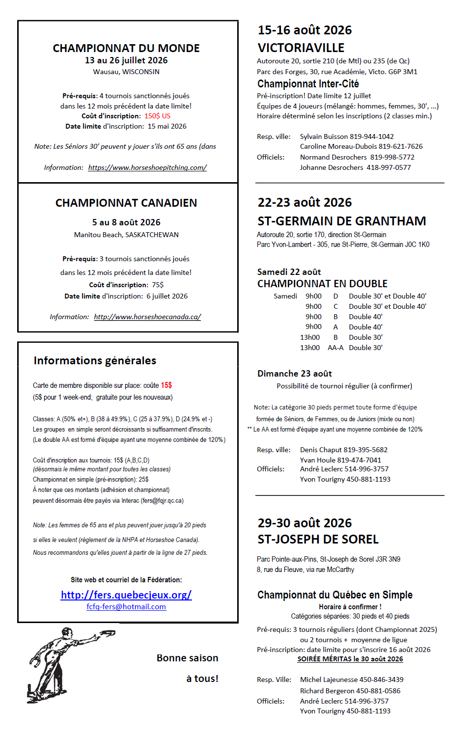 Note: Le Championnat du Monde aura lieu du 13 au 26 juillet 2026 à Wausau, Wisconsin. Le Championnat Canadien est prévu du 5 au 8 août 2026 à Manitou Beach, Saskatchewan.